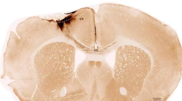 神经干细胞移植后小鼠大脑的冠状切面。虚线圆圈标示了中风区域。移植的人类细胞所发出的神经突起被染成深棕色。这些神经突起不仅向局部皮层(CX)延伸,还通过胼胝体(CC)延伸至另一侧大脑半球。图片来源:苏黎世大学
