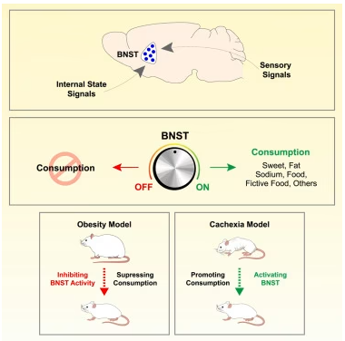 这项关于摄食"大脑旋钮"的发现有朝一日可能帮助正在接受化疗的癌症患者,他们常常经历恶病质,这种状况可能导致危险的食欲减退和体重下降。当给小鼠施用一种可引发类似恶病质状态的化疗药物时,研究人员发现刺激BNST可以保护它们免于体重减轻。