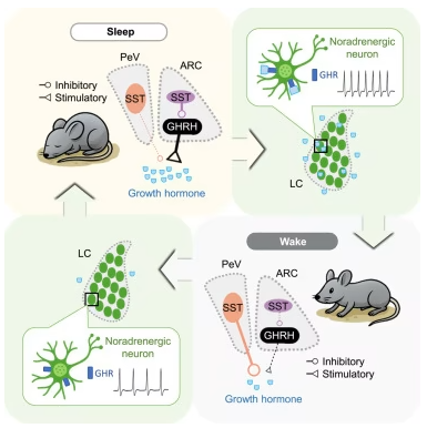 更令人惊喜的是,研究发现了一条此前未被认知的反馈通路:释放到体内的生长激素会 “反向作用” 于脑干的蓝斑区(LC)神经元,增强其兴奋性。蓝斑区是负责觉醒、注意力、认知和探索行为的关键脑区,其功能失调与多种精神和神经系统疾病密切相关。这种反馈形成了一种类似 “阴阳平衡” 的稳态调节:睡眠期间,生长激素逐渐积累并刺激蓝斑区,推动大脑向觉醒状态过渡;而 Dan Silverman 在早前研究中已发现,当蓝斑区过度兴奋时,反而会触发睡意。