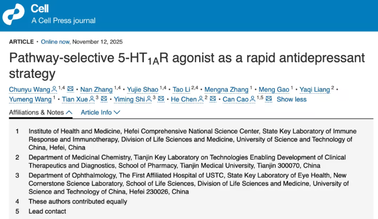 2025 年 11 月 12 日,合肥综合性国家科学中心大健康研究院/免疫应答与免疫治疗全国重点实验室/中国科学技术大学生命科学与医学部曹灿/王春玉团队与天津医科大学陈贺团队、中国科学技术大学生命科学与医学部薛天/史逸铭团队合作,在国际顶尖学术期刊 Cell 上发表了题为:Pathway-Selective 5-HT1AR Agonist as a Rapid Antidepressant Strategy 的研究论文。