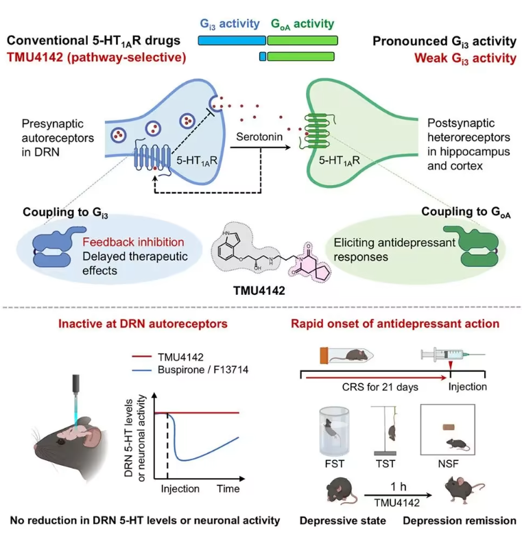 该研究提出了一种基于 5‑HT1AR 信号通路选择性的快速抗抑郁新策略,并据此理性设计出候选激动剂 TMU4142,其在抑郁小鼠模型中展现出显著的快速抗抑郁样效果。该策略解决了临床上选择性血清素再摄取抑制剂(SSRI)类抗抑郁药物普遍存在的起效缓慢难题,为新一代快速抗抑郁药物的研发提供了崭新的思路和可行路径。