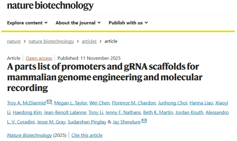 11月11日,《Nature Biotechnology》的研究报道“A parts list of promoters and gRNA scaffolds for mammalian genome engineering and molecular recording”,为我们打破了这一僵局。研究人员通过进化挖掘和合成设计,构建了一个包含数千个非重复、功能多样化且经过定量验证的启动子和gRNA支架“零件库”。