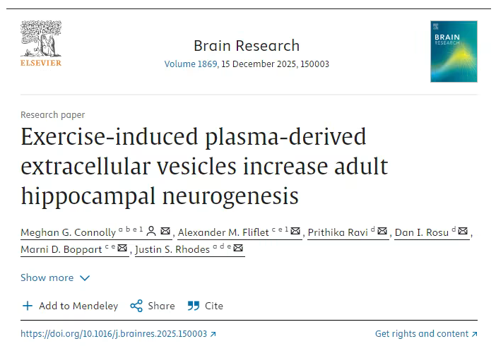 最近,发表在国际杂志《Brain Research》上的一项研究,为 “运动健脑” 提供了全新解决方案!来自伊利诺伊大学等机构的科学家们发现,从运动小鼠血液中提取的细胞外囊泡(ExerVs),注射进久坐不动的小鼠体内后,竟能使其大脑海马体新生神经元增加约 50%,这一发现不仅揭开了运动健脑的深层机制,更为认知障碍治疗开辟了无创新路径。