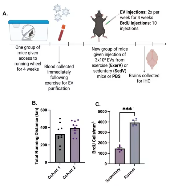 随后,研究人员在小鼠活动高峰期(夜间)采集运动组的血浆,通过尺寸排阻色谱和超滤技术分离提纯细胞外囊泡,最终得到富含活性物质的 ExerVs。接下来,他们给久坐小鼠进行腹腔注射,每次注射 3×10⁸个囊泡,每周两次,持续四周,同时用 5 - 溴脱氧尿苷(BrdU)标记分裂细胞,追踪新生细胞的命运。