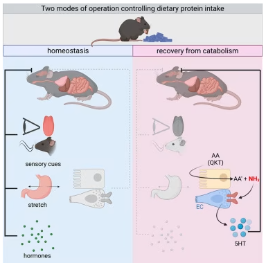 这条保护机制的核心是一条精密的肠-脑通路。研究团队通过同位素追踪发现,三种氨基酸的氨生成主要发生在十二指肠,这里的肠嗜铬细胞(体内主要的血清素分泌细胞)上,存在一种名为 TRPA1 的受体——它也被称为 “芥末受体”,专门感知有害化学物质。当氨在肠道产生时,会激活肠嗜铬细胞上的 TRPA1,触发血清素释放;血清素随后通过迷走神经传递信号至脑干的最后区和孤束核(这两个区域是食欲和恶心感的核心调控区),最终启动食欲抑制。