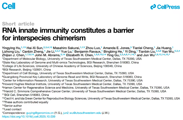 2025 年 11 月 24 日,德克萨斯大学西南医学中心吴军团队与基因组多维解析技术全国重点实验室/华大生命科学研究院顾颖团队合作(胡莹莹、孙海汐为论文共同第一作者),在国际顶尖学术期刊 Cell 上发表了题为:RNA innate immunity constitutes a barrier for interspecies chimerism 的研究论文。