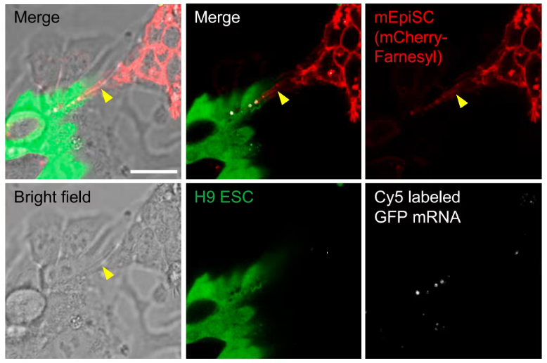 那么,小鼠细胞是如何检测到人类 RNA 的呢?研究团队进一步探索发现,小鼠细胞通过“隧道纳米管”(Tunneling Nanotube,TNT)直接从人类细胞中“窃取” RNA。