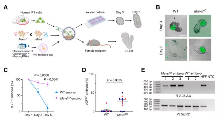 Mavs 缺陷型小鼠胚胎可提高人类多能干细胞在其体内的存活率和嵌合率;