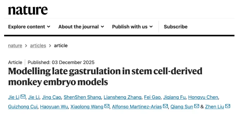 2025 年 12 月 3 日,中国科学院脑科学与智能技术卓越创新中心刘真研究员、孙强研究员及西班牙庞培法布拉大学 Alfonso Martinez-Arias 教授、西北农林科技大学王小龙教授合作(李杰、李杰、曹静、尚申申为该论文共同第一作者),在国际顶尖学术期刊 Nature 上发表了题为:Modeling late gastrulation in stem-cell derived monkey embryo models 的研究论文【4】。