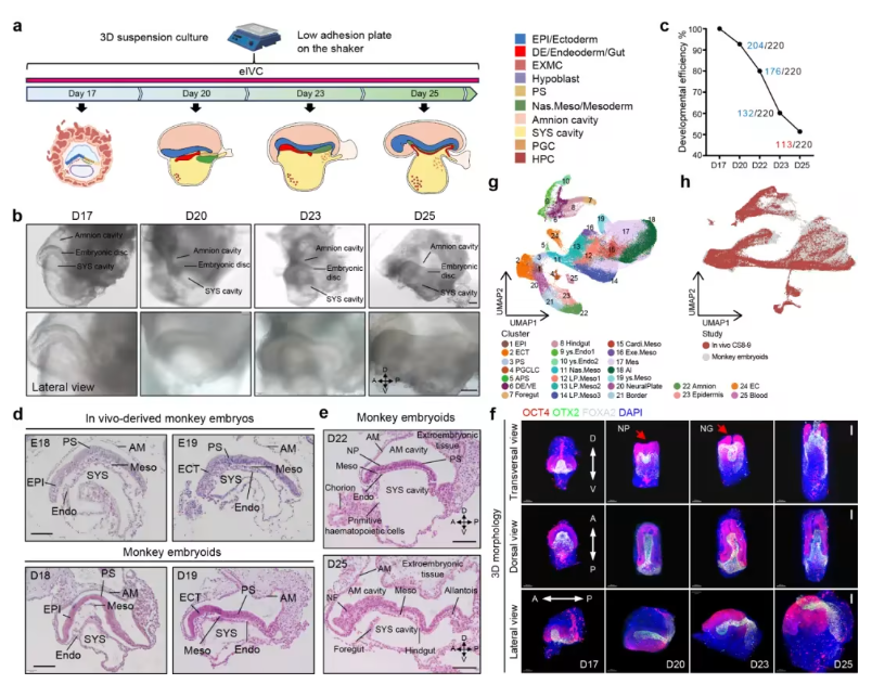 图1. (a) 猴类胚胎发育至第25天(D25)的三维悬浮培养系统示意图。(b) D17至D25猴类胚胎明场图。(c) D17至D25期间猴类胚胎发育效率统计。(d) E18和E19阶段天然猴胚胎(上)及D18、D19猴类胚胎(下)的对比。(e) 猴类胚胎在第22天(D22)和第25天(D25)的H&E染色图像。(f) D17-D25阶段猴类胚胎的3D重构图。(g) UMAP展示猴类胚胎所有细胞类型的分布。(h)猴类胚胎与CS8-9阶段天然猴胚胎的单细胞整合分析。