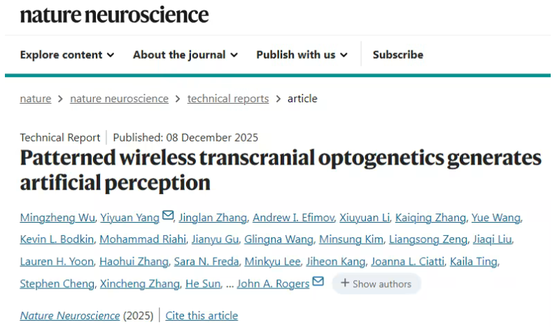 你是否想过,未来某天,人们可以像上传文件一样,把感官信息直接发送到大脑里?这听起来像是科幻情节,近日,一篇发表在国际杂志Nature Neuroscience上题为“Patterned wireless transcranial optogenetics generates artificial perception”的一项研究报告让这个梦想离现实更近了一步,文章中,来自美国西北大学的科学家开发出一款微型、全植入、无线控制的光遗传学芯片,其能直接通过头骨向大脑皮层发送光信号,让小鼠学会识别并响应这些“人工感知信号”,整个过程,完全不需要眼睛、耳朵或皮肤参与。