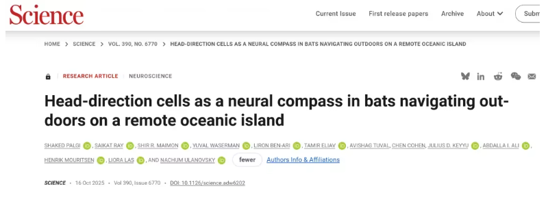 2025年10月16日,以色列魏茨曼科学研究所Nachum Ulanovsky团队在Science 在线发表题为“Head-direction cells as a neural compass in bats navigating outdoors on a remote oceanic island”的研究论文,在野外对空间神经元进行了电生理研究:研究人员记录了在一个遥远的海洋岛屿上不受约束地飞行和户外导航的蝙蝠的下垫前的头部方向细胞。这些神经元在整个岛屿的地理范围内稳定地代表了蝙蝠的方向,与月亮和银河系的动态无关。从第一次探索该岛开始,方向调整在几个晚上后稳定下来。这些结果表明,头部定向细胞可以作为一种可学习的、可靠的神经罗盘,用于现实世界的导航——突出了将神经科学带入野外的力量。
