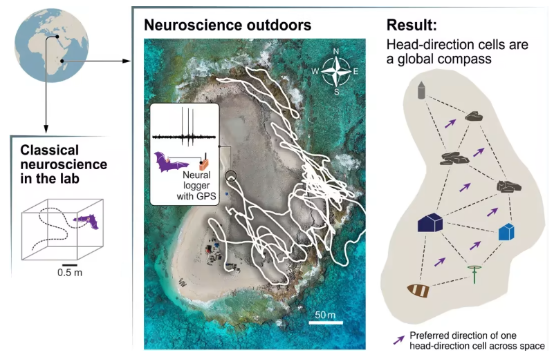 动物和人类生活在广阔而丰富的环境中,需要导航来找到自己的路。生态学家和动物行为学家对户外导航行为进行了广泛的研究。相比之下,导航的神经机制几乎只在室内、小型实验室环境中进行研究,这些实验室比现实世界的室外环境小得多,包含的感官信息也少得多。这给我们对导航的神经基础的理解留下了一个重大空白:大脑的“导航回路”在现实环境中是如何运作的?该研究关注的是头部定向细胞——一种根据动物的方向改变其活动的神经元,通常被称为“神经罗盘”。这些神经元在小环境中有很好的特征,但以前没有在户外的自然环境中进行过研究。