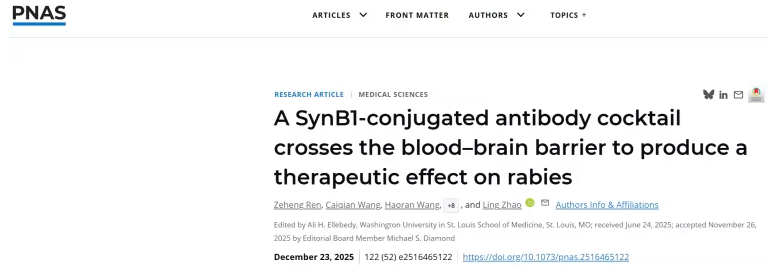 2025年12月23日,华中农业大学赵凌和周明共同通讯(任泽恒及王才茜为论文的共同第一作者)在PNAS 在线发表题为A SynB1-conjugated antibody cocktail crosses the blood–brain barrier to produce a therapeutic effect on rabies的研究论文。该研究首先制备了四种人-鼠嵌合抗体,它们均保留了针对RABV的中和效力,以提升其转化潜力。为实现抗体向脑部的递送,作者将一种先导嵌合抗体(7A3-H)与几种具有潜在BBB穿透能力的细胞穿膜肽(RVG、TGN、THR和SynB1)进行偶联。