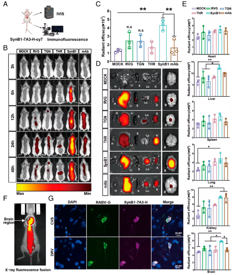 体内荧光成像显示,在促进抗体向脑部递送的BBB穿透能力方面,SynB1偶联显著优于其他肽段的偶联。此外,当将靶向RABV-G表位II/III/IV的三抗体鸡尾酒与SynB1偶联,并在感染后第5天(此时CNS入侵和症状已明显)给药时,可使感染致死性攻击病毒标准株(CVS)或犬源狂犬病毒株(DRV)的小鼠存活率达到80%。相比之下,未偶联的抗体鸡尾酒仅能提供20%(CVS)或0%(DRV)的存活率。综上所述,这些数据表明,SynB1介导的BBB穿透能力显著提高了抗RABV抗体的治疗效果,实现了狂犬病症状出现后的救治。这种抗体-肽偶联策略为推进狂犬病治疗提供了概念验证,其核心在于利用肽段介导的BBB穿透能力增强作用。