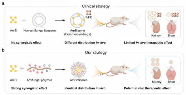 随着真菌耐药性日益增强,单一真菌药物治疗方案疗效往往不佳甚至失败。两种具有协同作用的药物组合,则能够表现出比单一药物更高的疗效,尤其在耐药和难治的感染性疾病中。然而,真菌系统性感染尤其是脑膜炎,两种药物在体内分布和药物代谢不同,很难实现体内协同效果,在临床上依然显示高死亡率,急需可以实现体内真实协同治疗耐药真菌感染的有效策略。