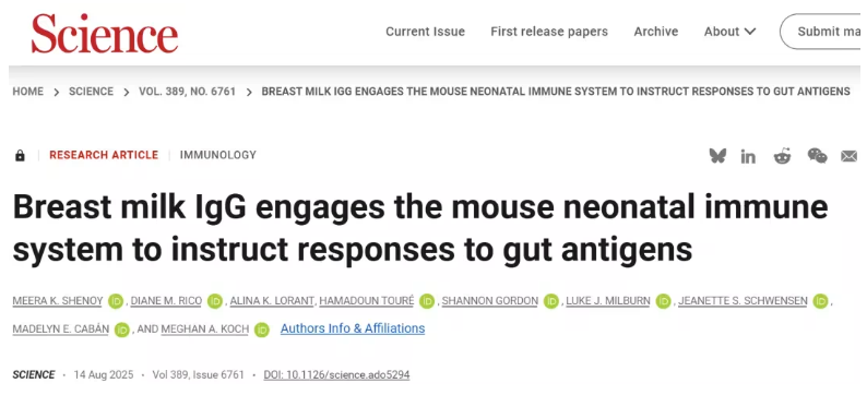 2025年8月14日,华盛顿大学Meghan A. Koch团队在Science 在线发表题为“Breast milk IgG engages the mouse neonatal immune system to instruct responses to gut antigens”的研究论文,该研究发现,在出生第一周摄入母体免疫球蛋白G (IgG),在断奶后几周抑制微生物依赖的适应性免疫反应。