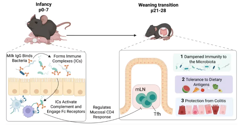 通过建立母系抗体缺乏小鼠模型,在不同的出生时间点交叉培养后代,该研究发现在断奶后数周,在出生后第一周摄入母乳抗体有助于抑制生发中心T滤泡辅助细胞(TFH细胞)和B细胞的反应。这种升高的免疫反应是肠道相关淋巴组织特异性的,在缺乏肠道微生物群的无菌动物中减弱。在出生后头7天给幼鼠喂食从乳汁或血清中纯化的IgG足以抑制后期的免疫失调。