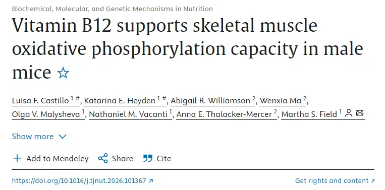 "我们在小鼠中观察到的另一件事是,B12缺乏似乎抑制了肌肉量的增长或维持,"Field说。"看起来,B12水平低与较低的肌肉量、可能还与肌肉力量有关。"