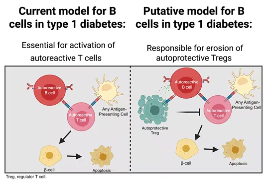 B细胞被认为是驱动免疫系统攻击产胰岛素β细胞的免疫细胞,通过激活抗胰岛T细胞来实现。发表在《糖尿病》杂志上的这项研究表明,它们还通过干扰和限制调节性T细胞(Tregs)的功能扮演了更邪恶的角色,而Tregs有助于平息免疫系统。