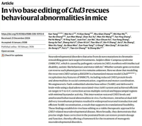 2月19日凌晨,国际顶级科学期刊《自然》刊登了由上海交通大学医学院附属新华医院发育行为儿童保健科及教育部-上海市环境与儿童健康重点实验室教授李斐、副研究员杨侃团队,与上海交通大学医学院松江研究院研究员仇子龙团队、复旦大学脑科学转化研究院研究员程田林团队和中国科学院分子细胞科学卓越创新中心李劲松院士团队通力合作完成的一项新成果:他们发明了一种办法,能钻进大脑里,把这个“错字”精准改回来。