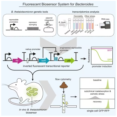 生物传感器通常通过改造细菌,使其在受到应激时发光来制造。然而,在多形拟杆菌中,这种发光太弱而难以检测。为了解决这个问题,研究人员将这个系统反过来:他们改造了细菌,使其在正常条件下发出明亮的荧光,而在应激时减弱。因此,肠道中较高的渗透压应激会导致较弱的荧光,使研究人员能够通过信号衰减的程度来测量应激水平。