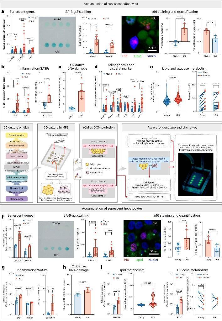 团队将新生组织浸润于62岁以上捐赠者的血清中循环,并以21—34岁年轻捐赠者血清作为对照。结果显示,器官芯片中接触老年血清的细胞,在4天内便呈现出需数十年才能在人体出现的慢性炎症、血糖调节受损及脂肪代谢紊乱。