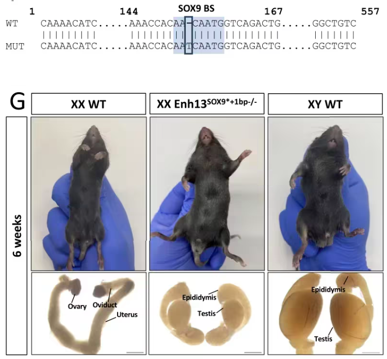 研究团队通过 CRISPR-Cas9 基因编辑技术,在小鼠 Enh13 的 SOX9 结合位点引入了两种微小突变:一种是 3 个碱基对的缺失(-3bp),另一种是单个碱基对的插入(+1b p)。令人惊讶的是,携带这些微小突变的 XX 小鼠竟然表现出完全的性别逆转,长出了雄性生殖器官和睾丸。